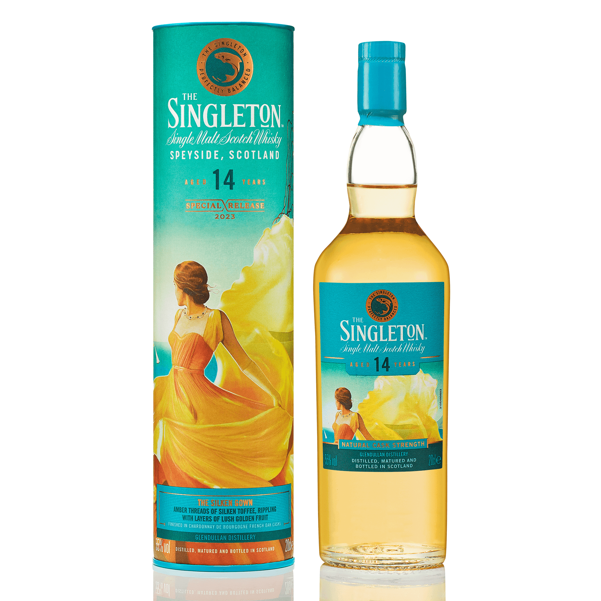 Introducing The Singleton of Glendullan 14 Year Old Special Releases 2023 Single Malt Scotch Whisky bottled at natural cask strength - Lavish layers of silken texture ripple in the gentle breeze, catching the vivid light of the stunning French coastline, glowing resplendently. Shimmering gold, kissed by the gentle fig and citrus aromas of the coastal air, the stunning gown possesses an indulgent allure. Luminous and enchanting, it is the masterpiece of a silk atelier.